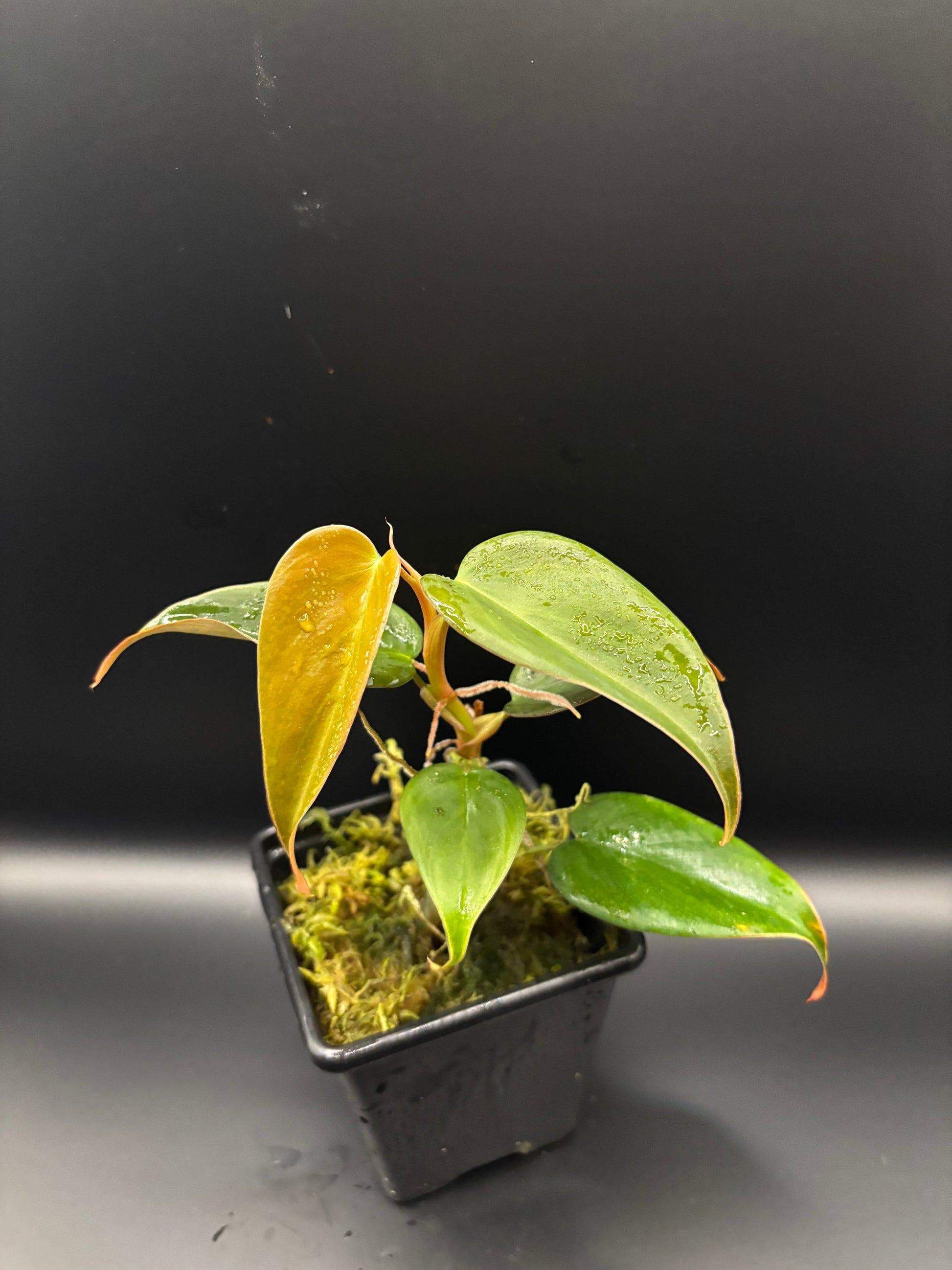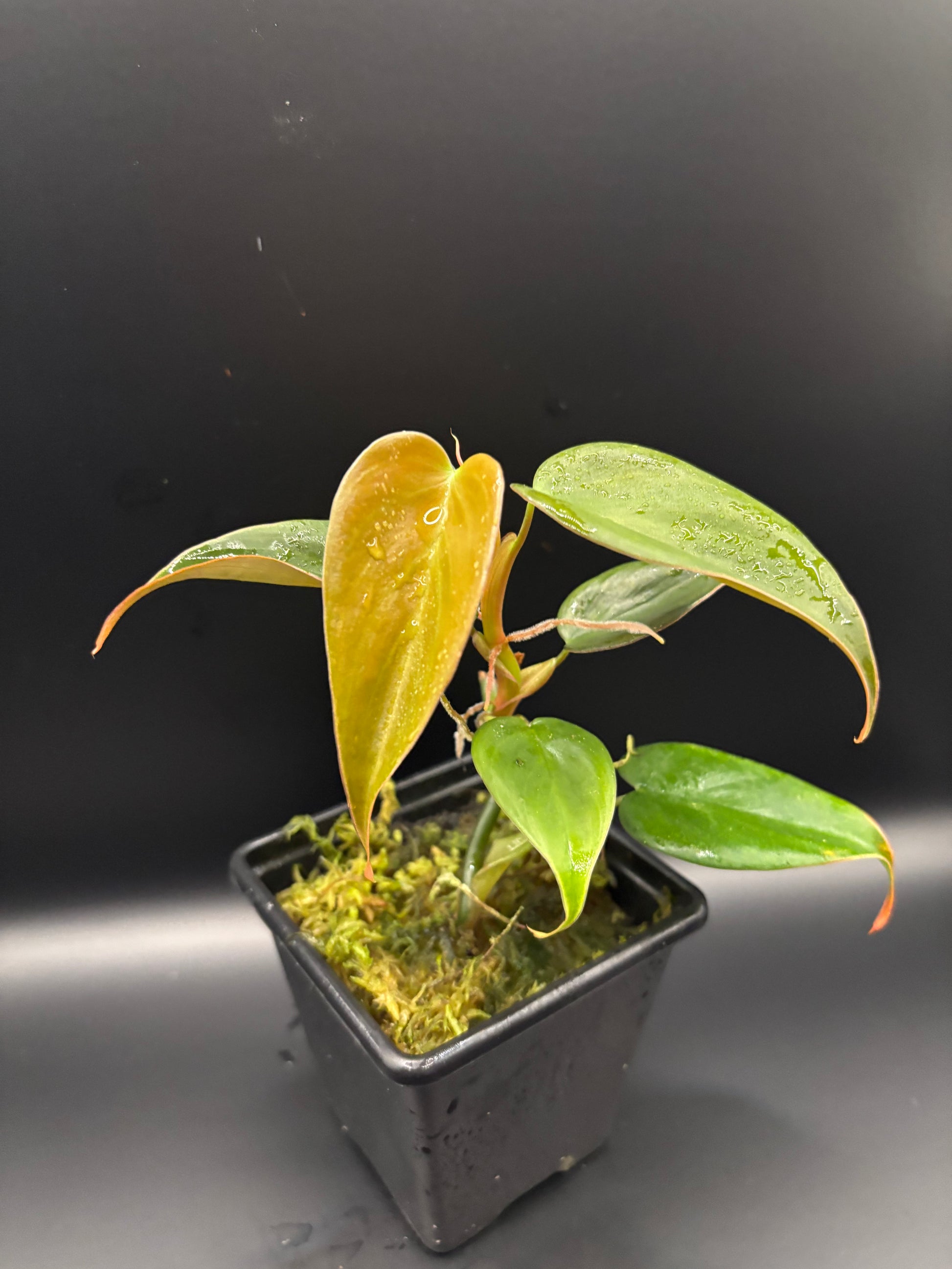 Philodendron sp. 'Peach' is a striking, compact species known for its vibrant peach-colored petioles. When grown in terrarium conditions, the leaves typically stay around 3-4 inches in size. The standout feature of this plant is the beautiful contrast between the soft peach petioles and its otherwise lush green foliage, creating a captivating visual in any terrarium. Based on our experience, it thrives with consistent moisture and moderate to bright light.